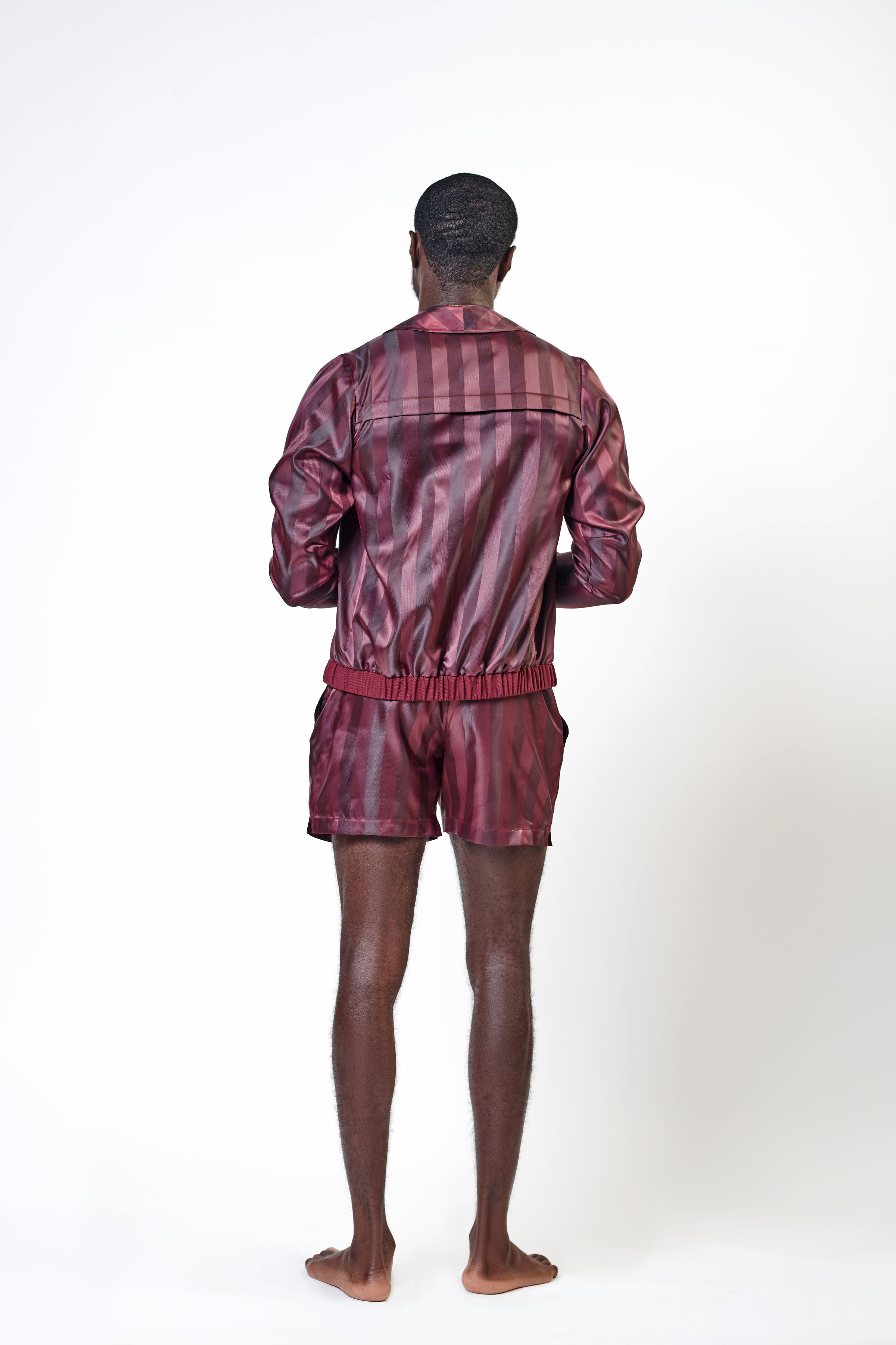 • Maroon swimshorts with ribbed waistband with striped Maroon viscose pocket details