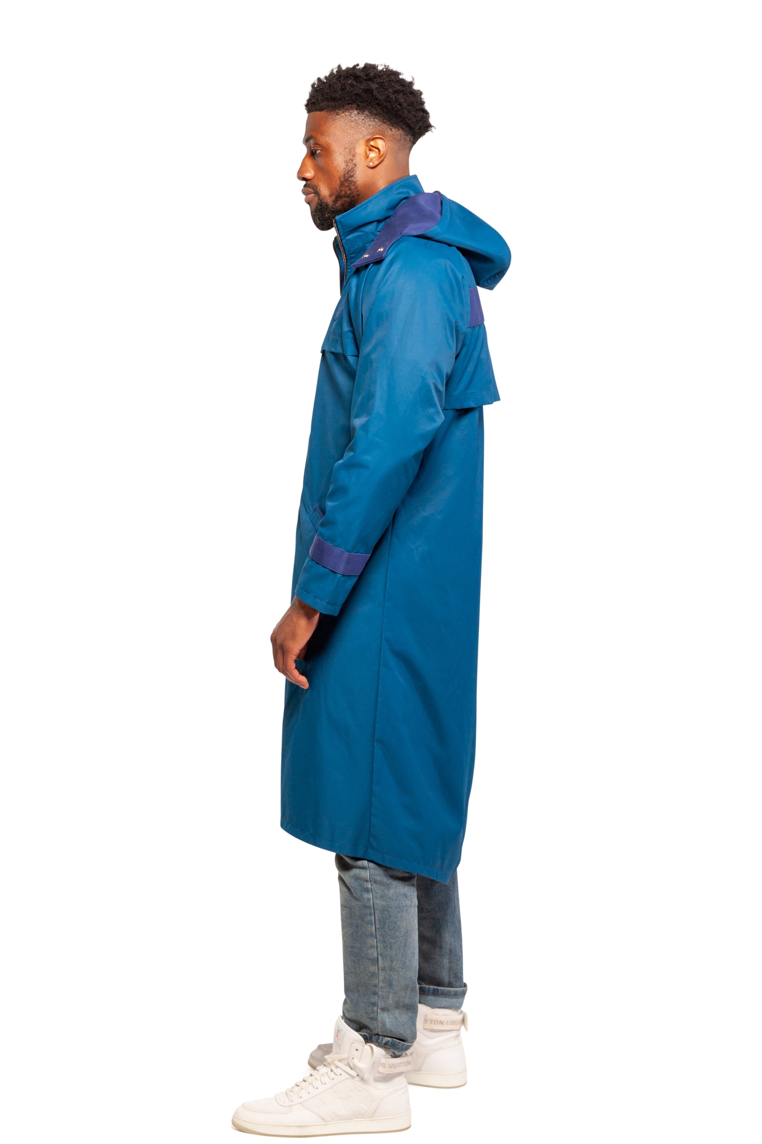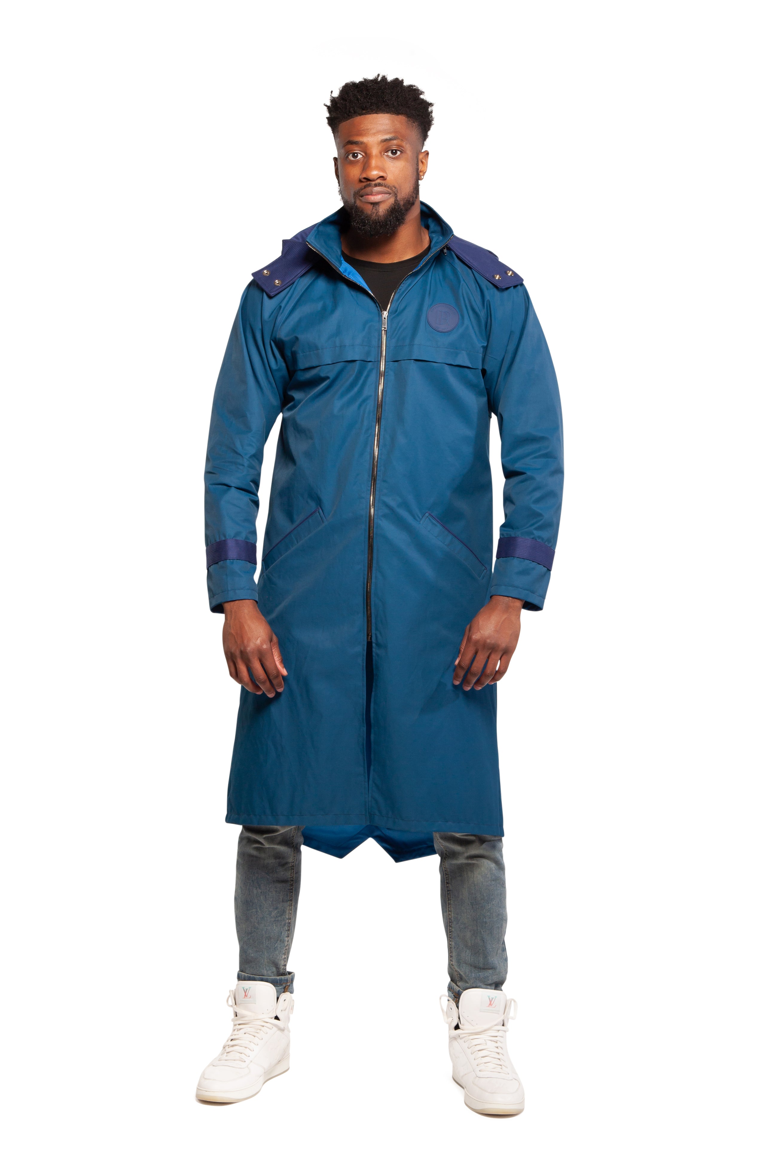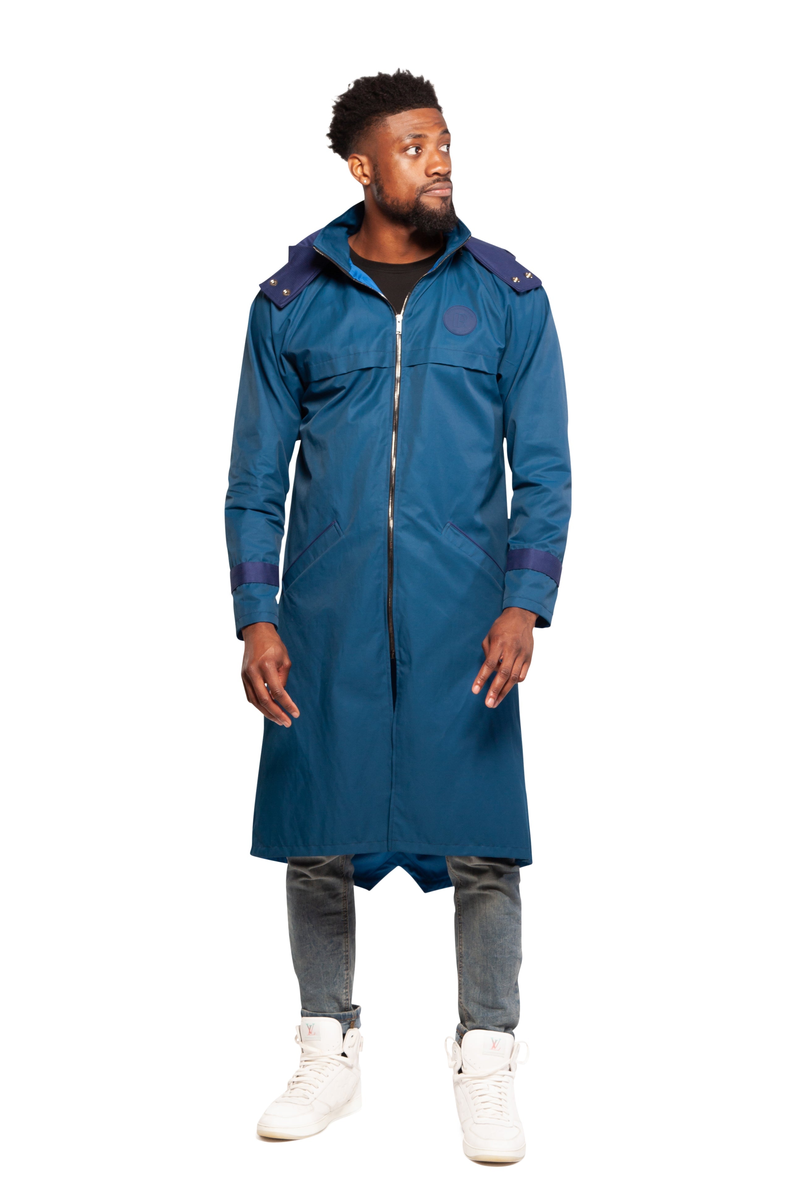 A person wearing a blue parka with a black zipper and turquoise reversible nylon fabric details, featuring a V cut bottom tail. Parka Rain Coat Parka Rain Coat Parka Rain Coat Parka Rain Coat